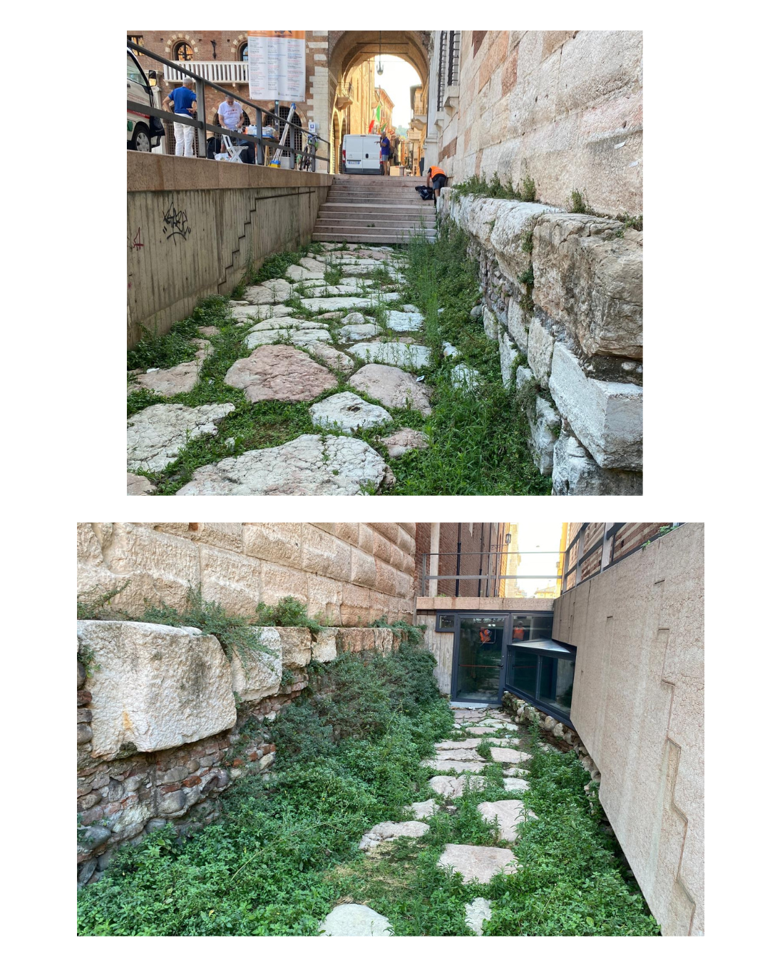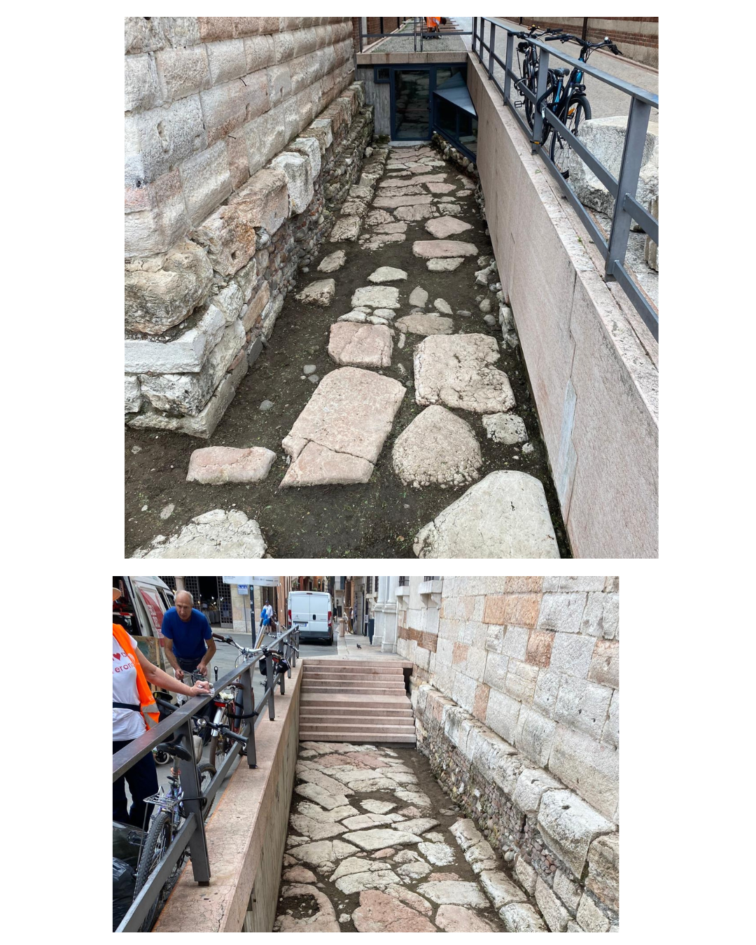 Il percorso che si diparte da Piazza dei Signori e costeggia via D. Alighieri, due metri al di sotto dell’attuale livello stradale, è denominato Strada Romana e fa parte di un complesso di scavi che si estende ampiamente in quell’area ove migliaia di turisti ne ammirano le vestigia.