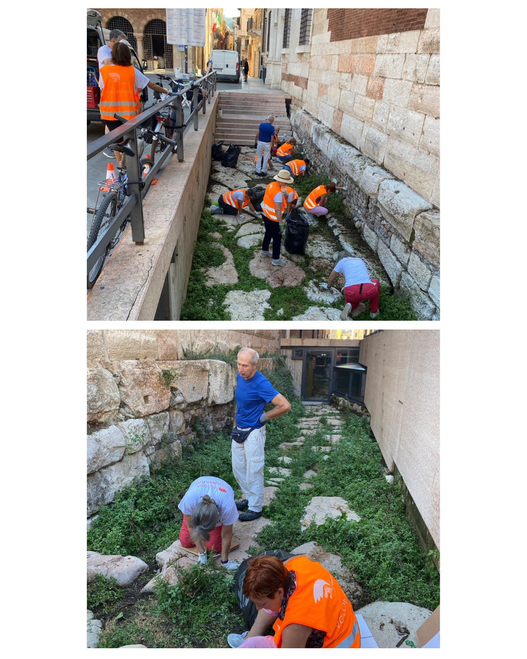 Per contrastare queste ultime, il restauratore di opere d’arte Claudio Montoli ha nebulizzato sulla vegetazione cresciuta tra le pietre del basolato romano una soluzione di acido pelargonico al 20-25% diluito in acqua, assistito e coadiuvato da un bel gruppo di operosi Angeli in casacca arancione. Tale intervento è stato ripetuto a distanza di 10 giorni, in attesa di poter procedere alla rimozione definitiva delle erbacce ingiallite.